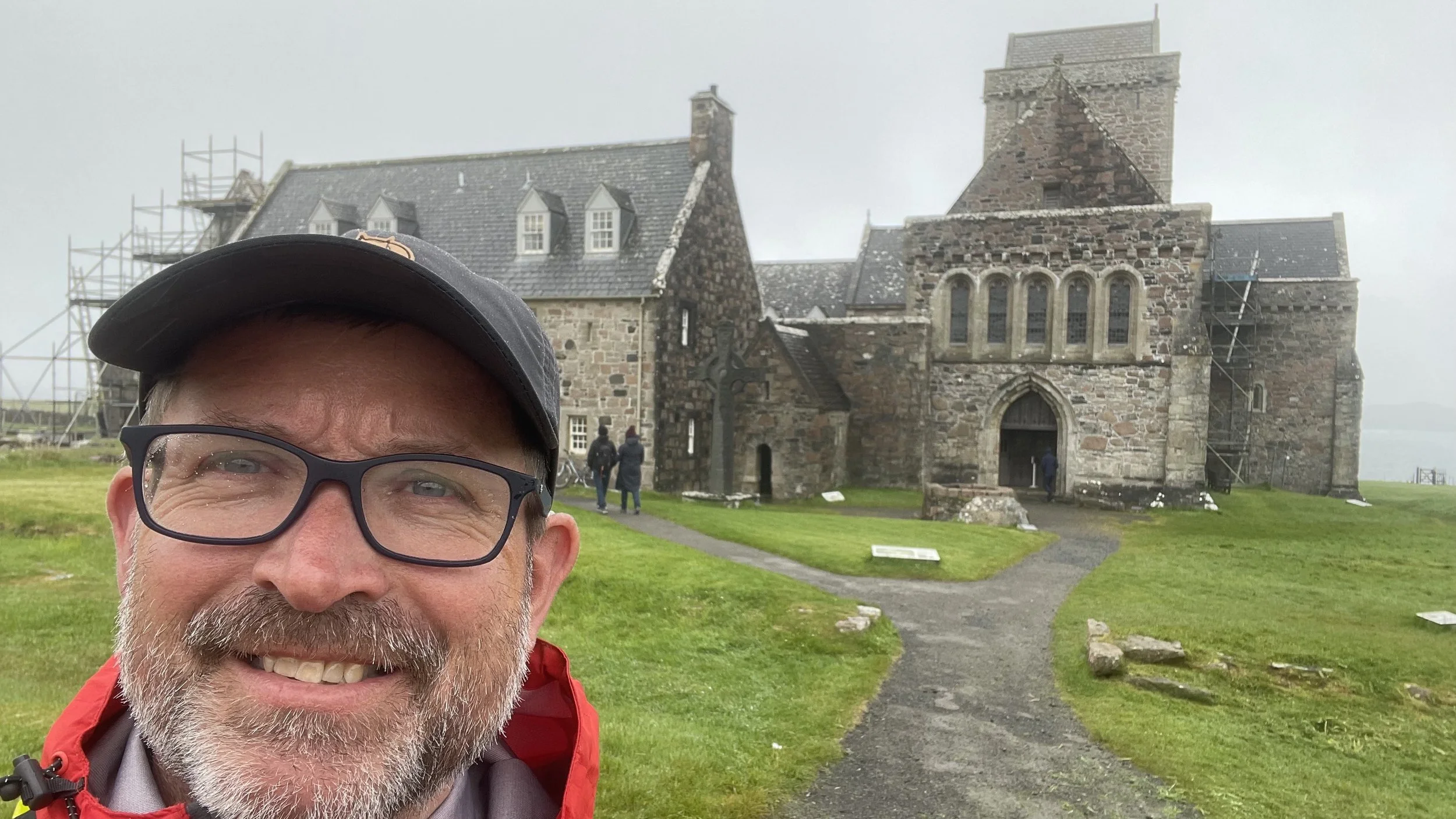 So, after many months of preparation - plotting my route, buying walking gear, booking each night’s accommodation – at the start of May at last I found myself walking barefoot towards the mainland through the wet mud and sand of a parted North Sea, my walking boots dangling around my neck by their laces. My final blister-free night had been spent in the Manor House Hotel, overlooking the statue of Saint Aidan himself which stands next to the ruins of Lindisfarne Abbey. My wife Sally had joined me for this first day of the walk, and the sun shone upon us as we reached the mainland, pulled on our socks and shoes, and strode out across the Northumbrian fields towards that day’s destination, the town of Wooler. Seventeen days, and countless encounters with strangers later, my eyes at last fell upon the iconic sight of Iona Abbey, which on that particular day could just about be made out through a torrential shower of rain!
